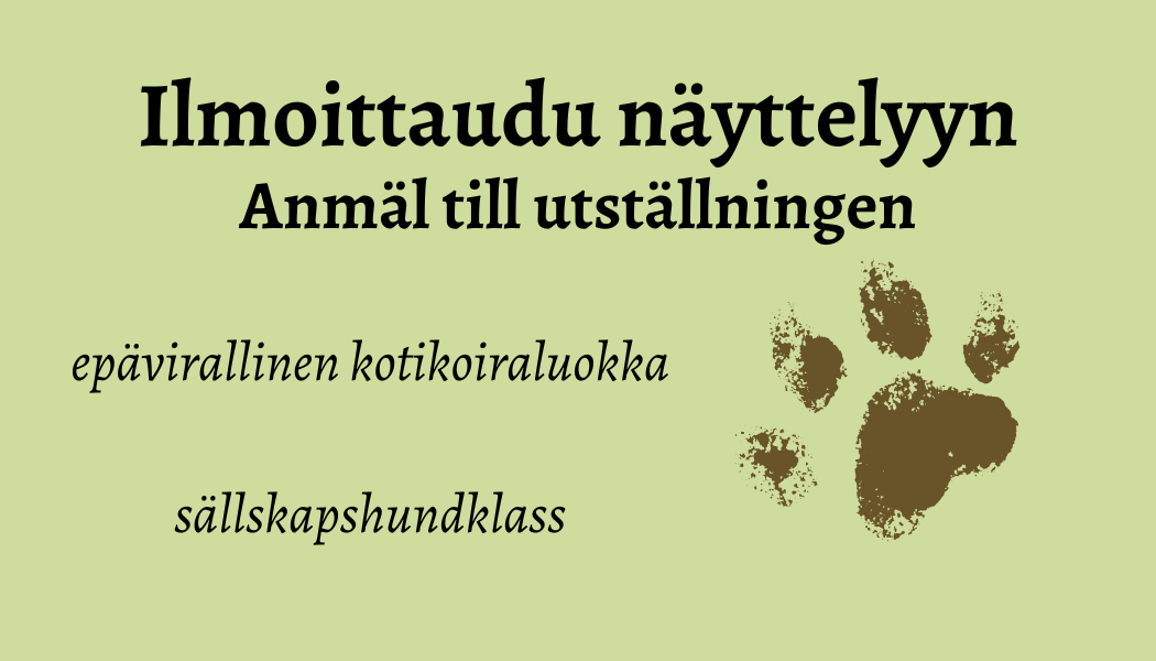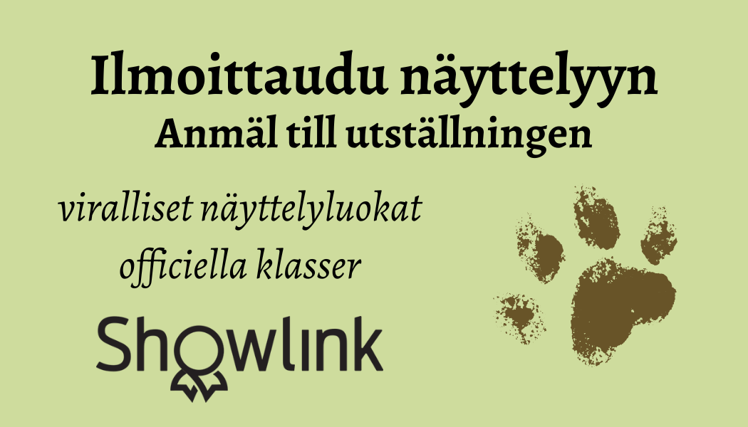 Dopingvalvonta koskee kaikkia Suomen Kennelliiton myöntämiä näyttelyitä, kilpailuja ja kokeita. Ajankohtaisinta tietoa osoitteessa Kennelliitto/antidoping. | Vid anmälan till utställning förbinder sig utställaren att följa Finska Kennelklubbens gällande utställningsregler och kompletterande direktiv samt vaccinations-bestämmelser. Reglerna finns här. Anmälan till utställningen sker endast elektroniskt. Anmälan till de officiella klasserna ska göras via Showlinks anmälningssystem och till de inofficiella klasserna med ett separat webbformulär – enbart betalning av utställningsavgiften räknas inte som anmälan. För sent inkomna anmälningar godkänns inte till utställningen. Uppfödaren anmäls automatiskt till uppfödarklassen när minst fyra (4) av hans/hennes uppfödningar är anmälda till utställningens officiella klasser. OBS!